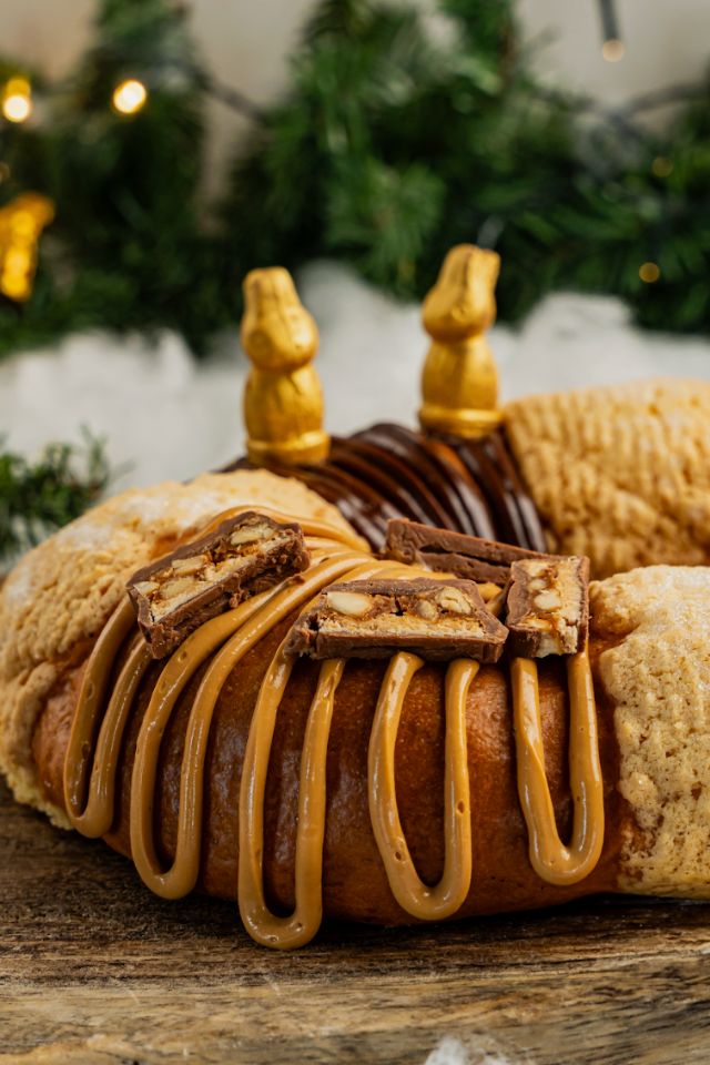 From the first look, you can tell it’s not the usual Rosca De Reyes. It’s topped with dulce de leche frosting and a creamy hazelnut frosting with almonds—soft, rich, and honestly… just thinking about it makes your mouth water.